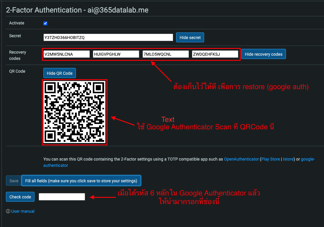 - จากนั้นนำเลขที่แสดงในระบบ Google Authenticator 6 หลักมาใส่ในช่องด้านล่าง จากนั้นกดปุ่ม Check Code
