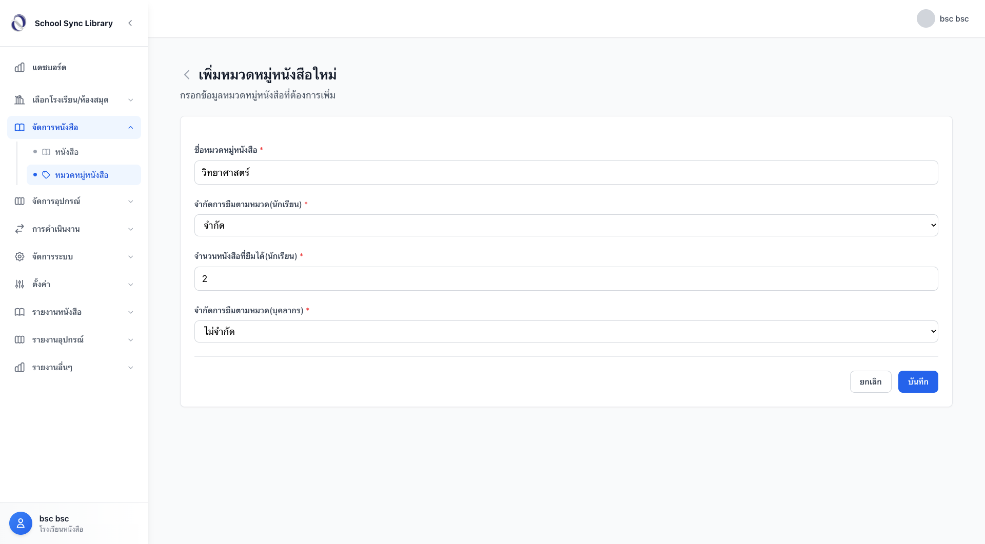 - ตัวอย่าง: หากตั้งค่า "จำกัด 2" สำหรับนักเรียน หมายความว่านักเรียน 1 คน จะยืมหนังสือในหมวดนี้ได้พร้อมกันไม่เกิน 2 เล่ม หากต้องการยืมเพิ่ม ต้องนำเล่มเดิมมาคืนก่อนระบบจึงจะอนุญาตให้ยืมใหม่ได้