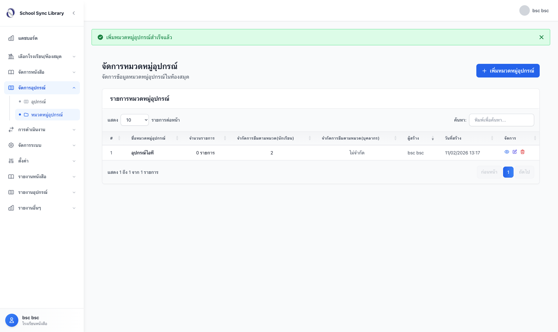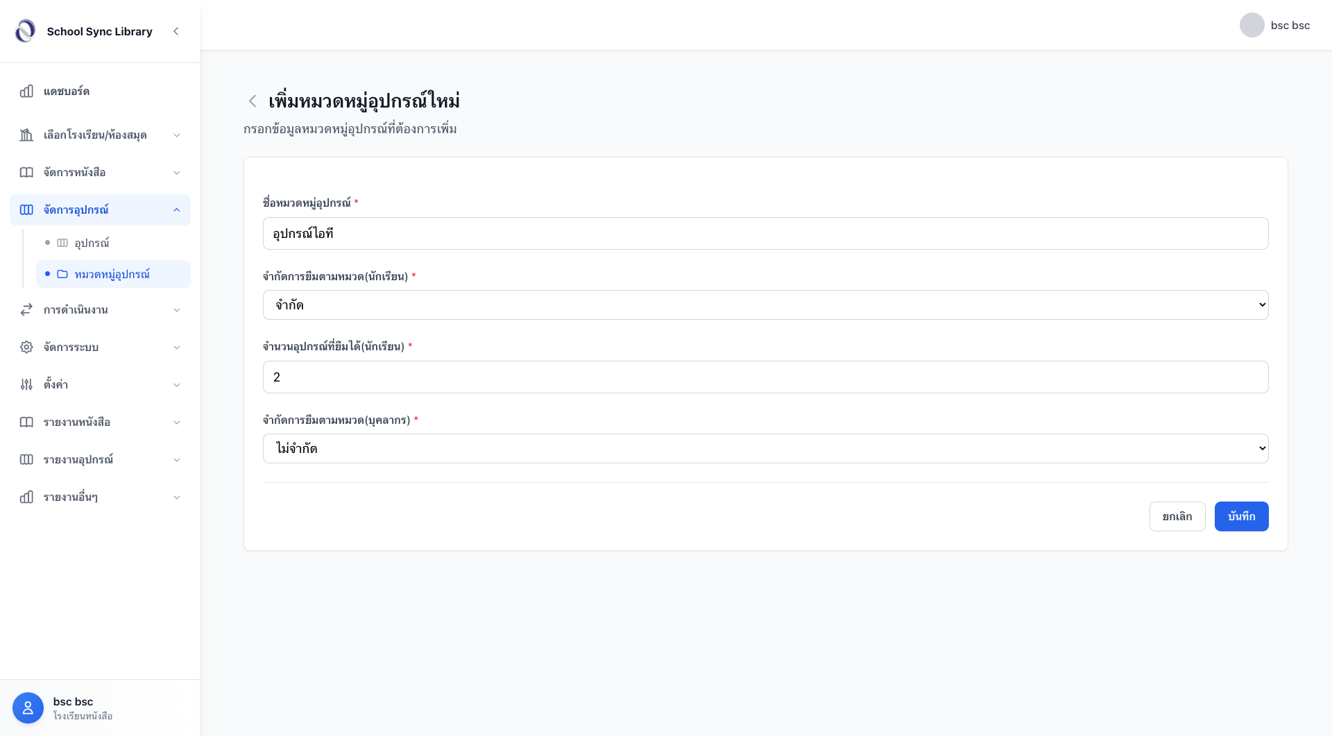 - ตัวอย่าง: หากตั้งค่า "จำกัด 2" สำหรับนักเรียน หมายความว่านักเรียน 1 คน จะยืมอุปกรณ์ในหมวดนี้ได้พร้อมกันไม่เกิน 2 อุปกรณ์ หากต้องการยืมเพิ่ม ต้องนำอุปกรณ์เดิมมาคืนก่อนระบบจึงจะอนุญาตให้ยืมใหม่ได้