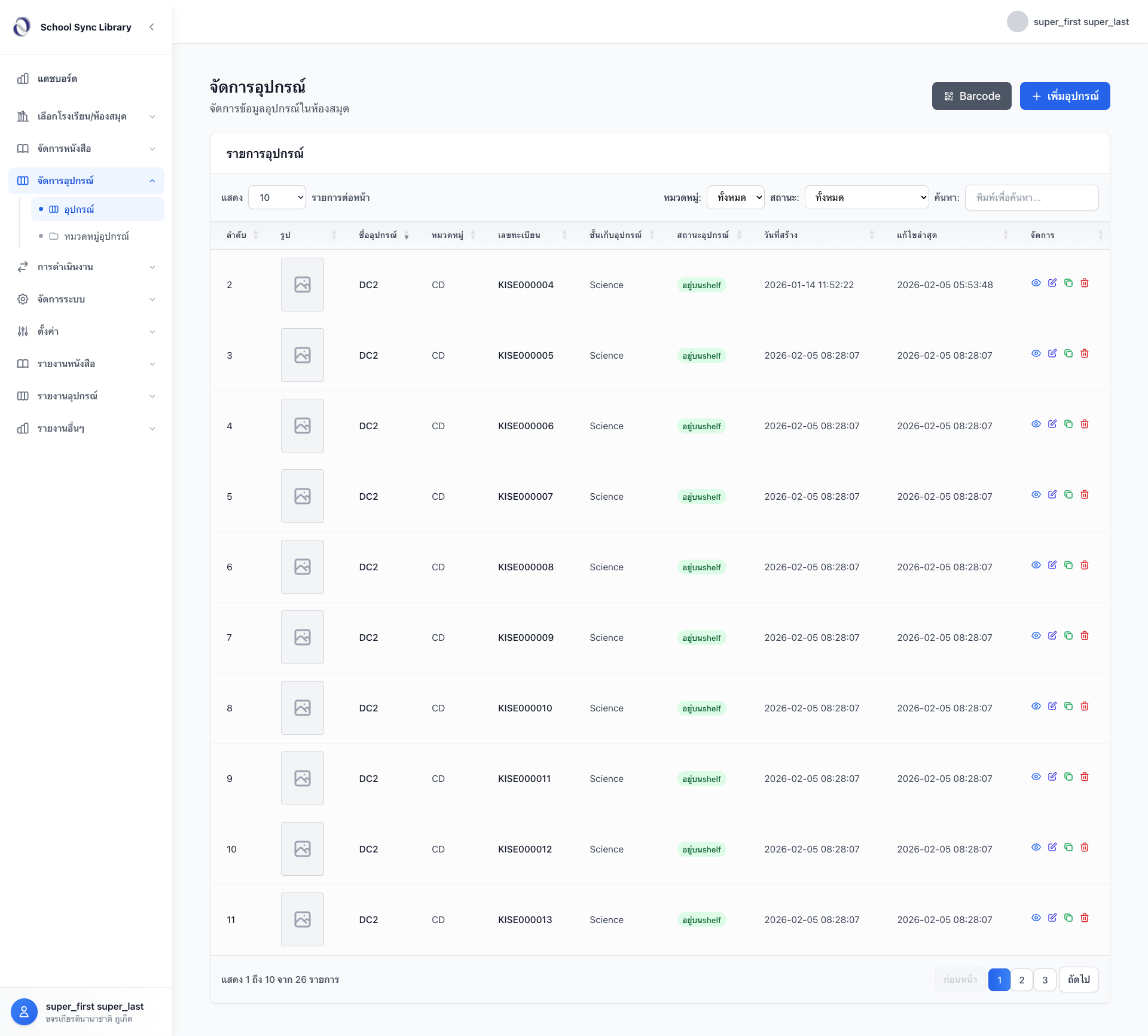 เมื่อท่านคลิกเข้าสู่เมนู จัดการอุปกรณ์ > อุปกรณ์ ระบบจะแสดงรายการอุปกรณ์ทั้งหมดที่มีอยู่ในห้องสมุด:
